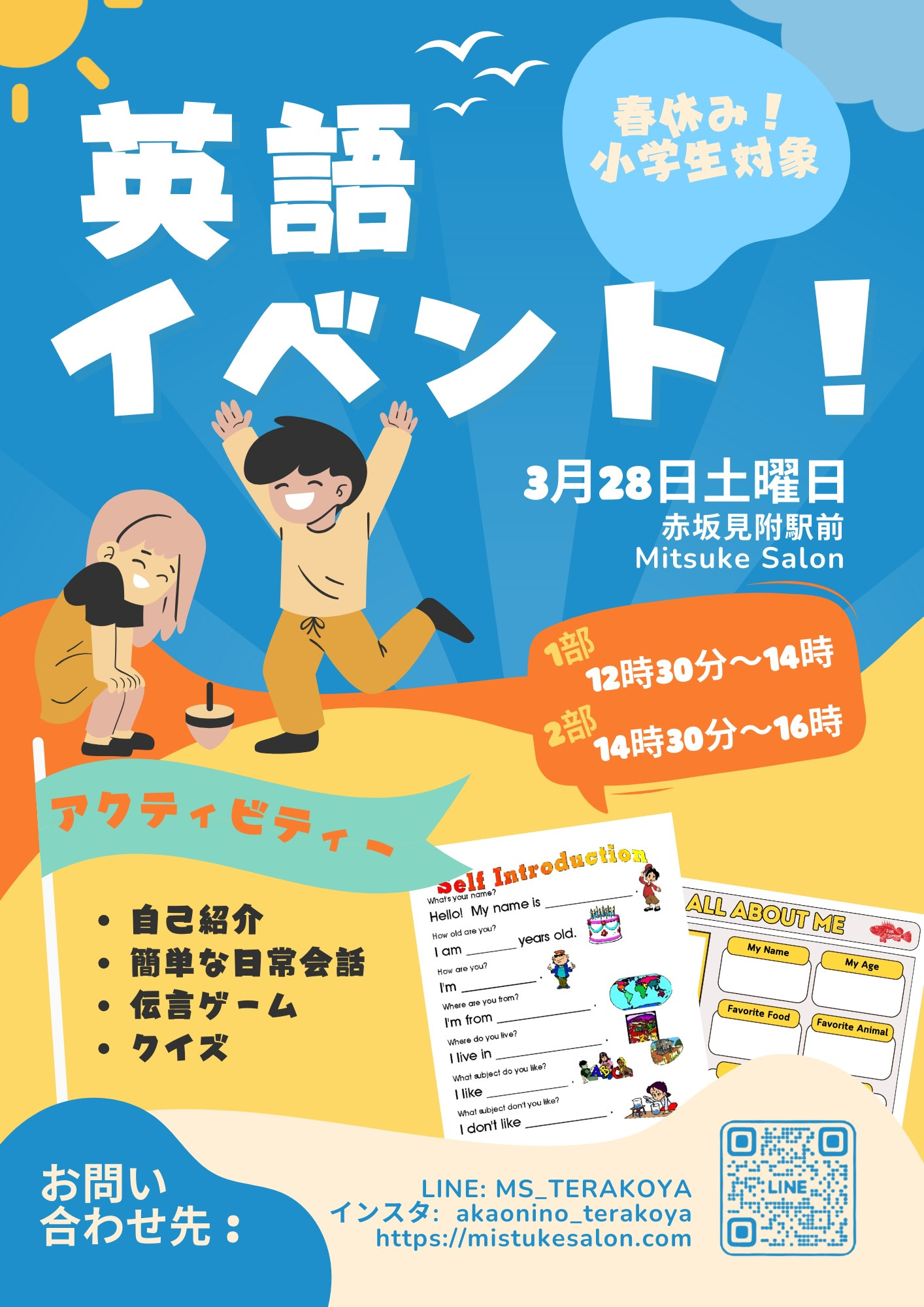 お申し込みは 画像のQRから LINEで「3月28日英語イベント」と記載の上、希望の時間を書いてお申し込みください